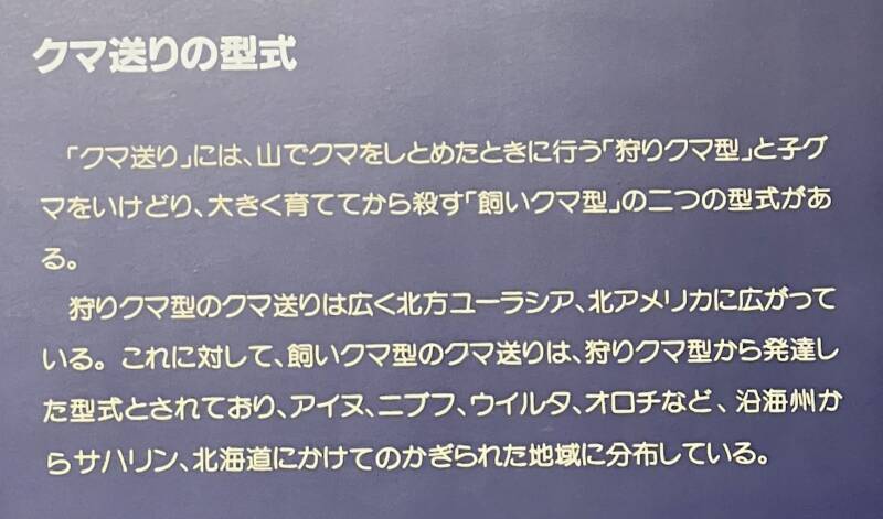 母グマは冬ごもり中に仔グマを出産する。アイヌの人たちは、春先にその母グマを殺し、山でその送りを行い、仔グマを集落に連れ帰るのである。北海道の場合はその仔グマが二歳になった冬に—樺太(サハリン)の場合は三歳まで育てることがあるというが—、それを殺して送りを行うのである。それが「仔グマ飼育型クマ送り」であり、一般的にいうイオマンテ(イヨマンテ)である。