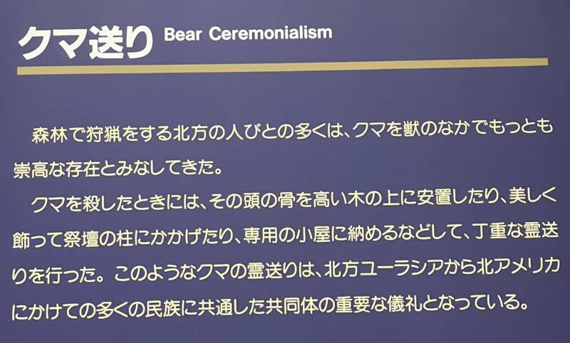 熊送りには熊を狩った時に行う儀式と、飼いならした子熊が大きくなって殺す時に行う儀式があるという。後者は特に残酷さが際立っている。写真を見るとまだ子供の熊も対象になっている。現代なら動物愛護団体の抗議の対象になりそうだが、私達だってまだ子供の生き物を食べ物として取り入れていることはあるし、残酷さには変わりないのだ。むしろ残酷さから目を背けない所に学ぶべき所もあるかもしれないと感じた。