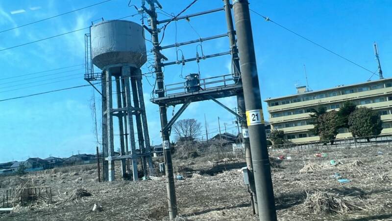 羽越本線の車窓から見た旧坂町機関区の給水塔。近くに転車台もあるのだが分かりづらかった。この転車台は現代もSL運行時に使われるらしい。