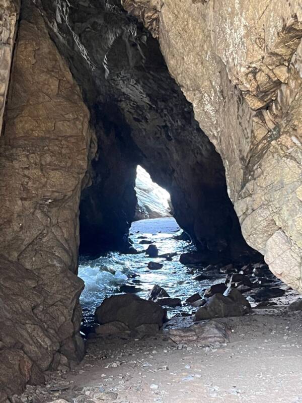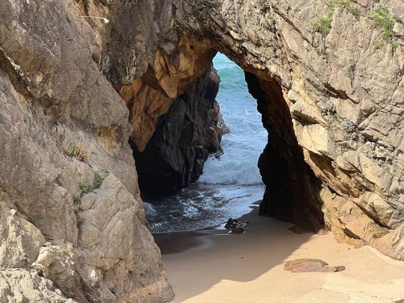 宝屋隧道(ほうやずいどう)と近くの岩窟 村上市 2023.03.25 2023.03.29 根込隧道のすぐ先にある隧道。 宝屋隧道そばの巌窟。 天然の隧道のようになっていて通り抜けできる。 砂浜は黄色っぽい石の粒。青みがかった岩もあるが、花崗岩か何か? トンネル・隧道