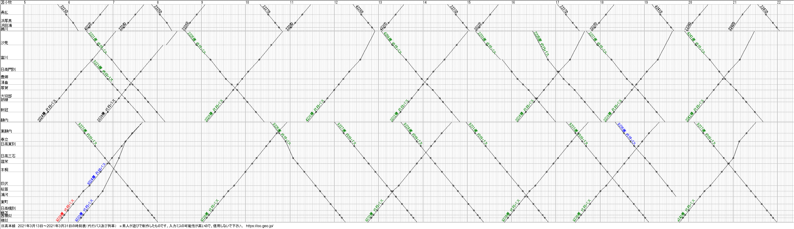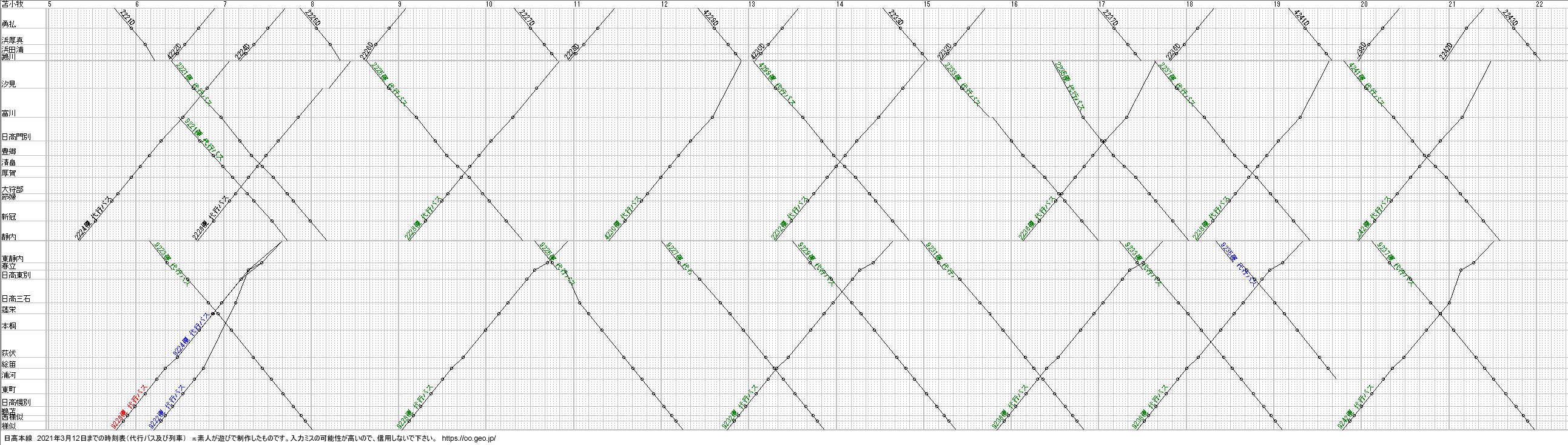 OuDiaを使用して作ってみた往時の日高線(代行バス)のダイヤグラムです。素人の遊びのため、誤記入あると思います。信用しないでください。