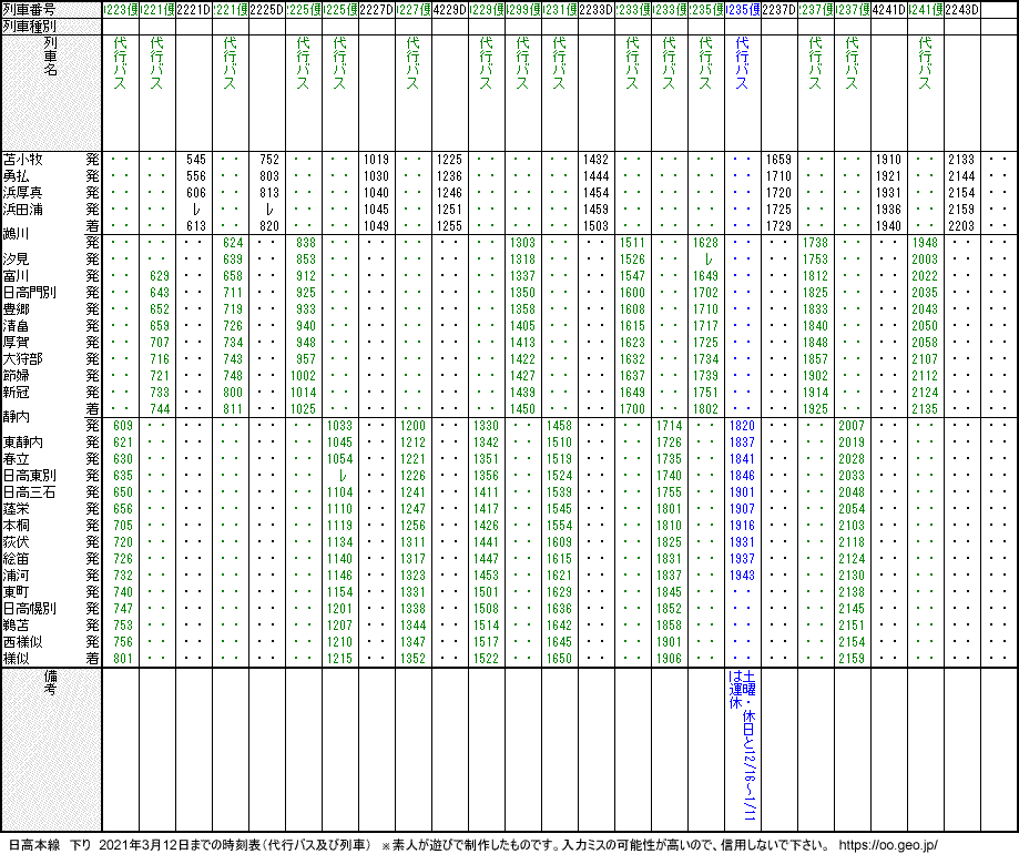 日高本線 下り 2021年3月12日までの時刻表(代行バス及び列車)