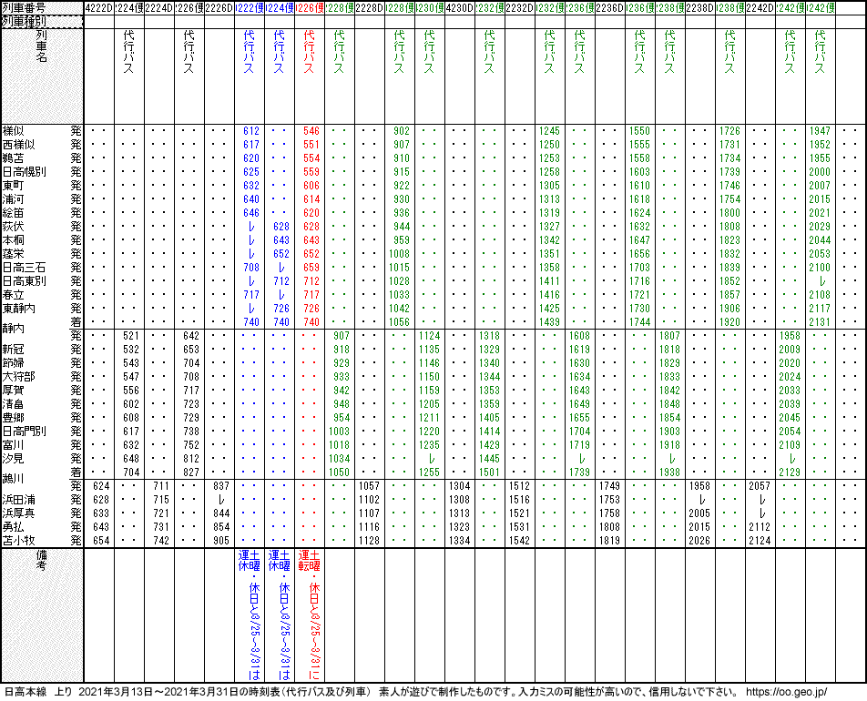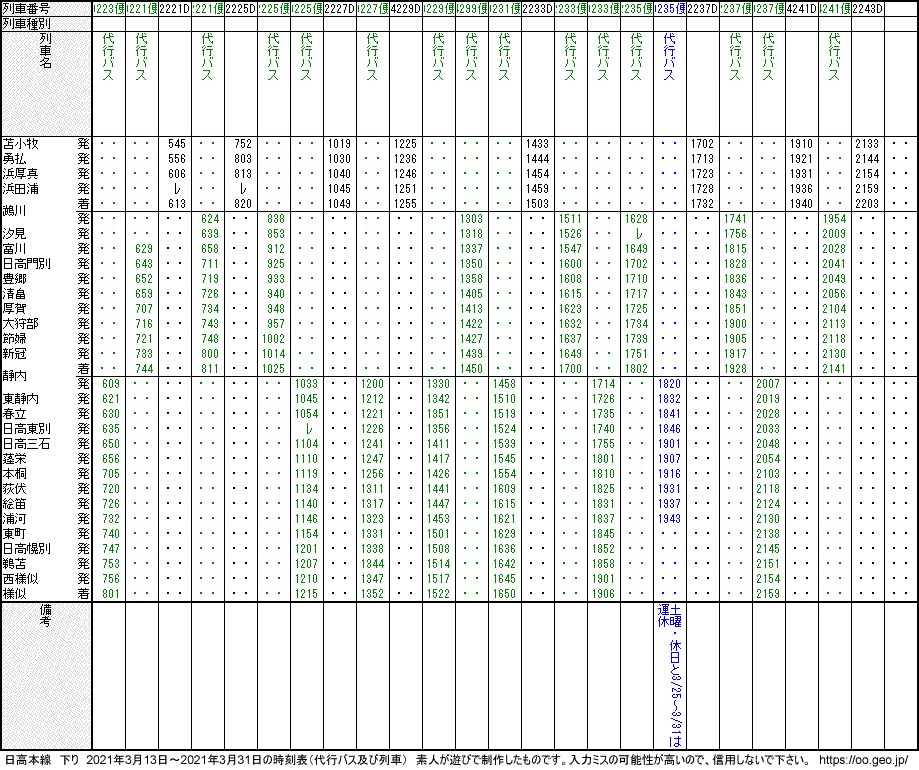 日高本線 2021年3月13日~2021年3月31日の時刻表(代行バス及び列車)
