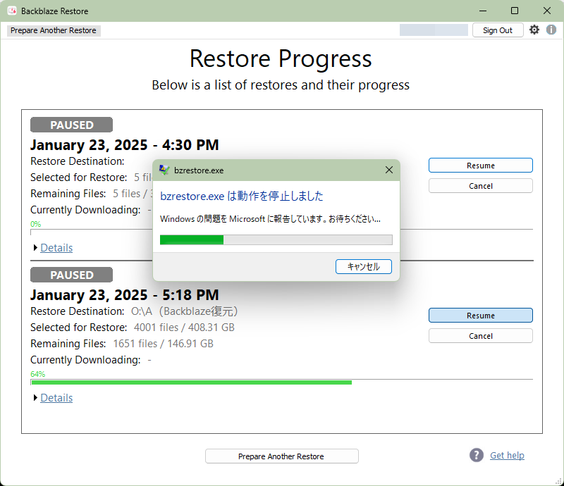 Backblazeの復元アプリ(Backblaze Restore App)が「bzrestore.exeは動作を停止しました。問題が生じたため、プログラムが正しく動作しなくなりました。プログラムは閉じられ、解決策がある場合はWindowsから通知されます。」と表示されて起動できなくなって困ってたんだけど、やっと解決方法見つけた。